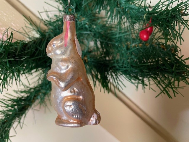 Antieke oude kerstbal een haas of konijn van dun geblazen glas in roze 2e helft 1900