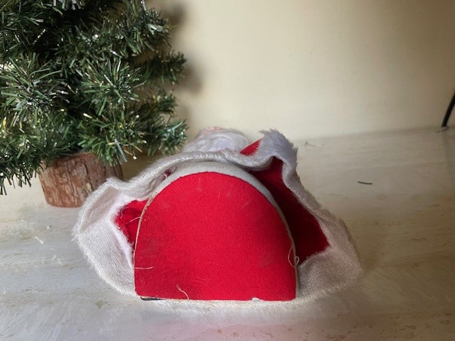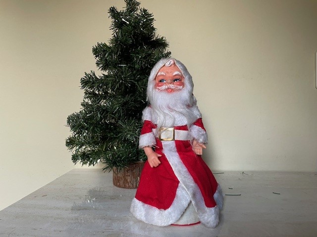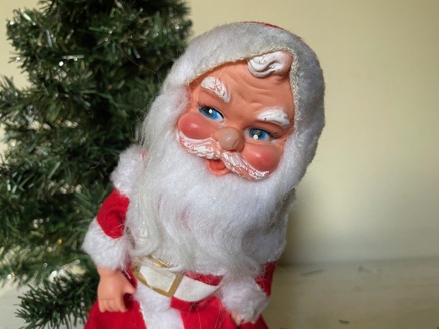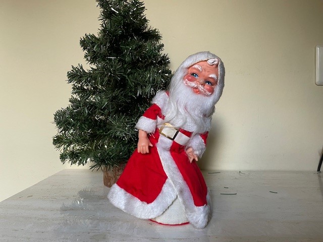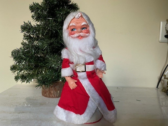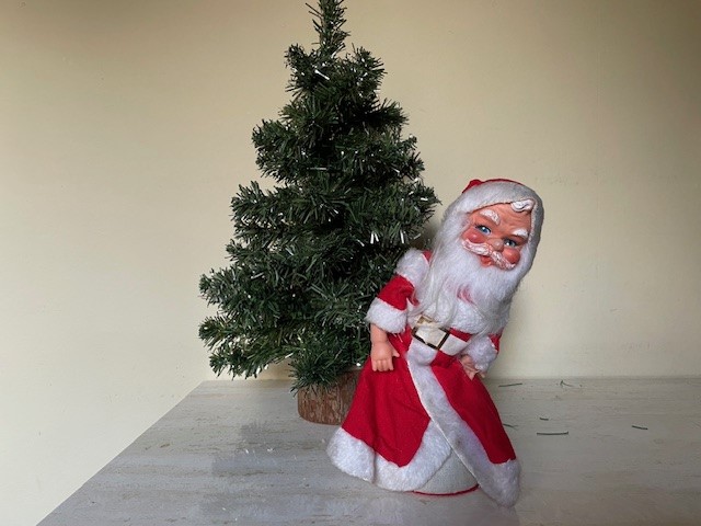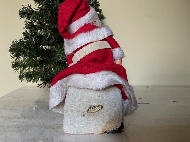 Oude antieke mechanische kerstman en muziekdoos die aan de achterzijde opgedraaid wordt en dan rondjes swingend “Jingle Bell’s” ten gehore brengt. De Kerstman is 24 cm. hoog en dateert van de jaren 1950-1960.