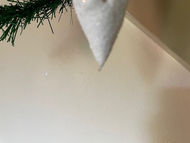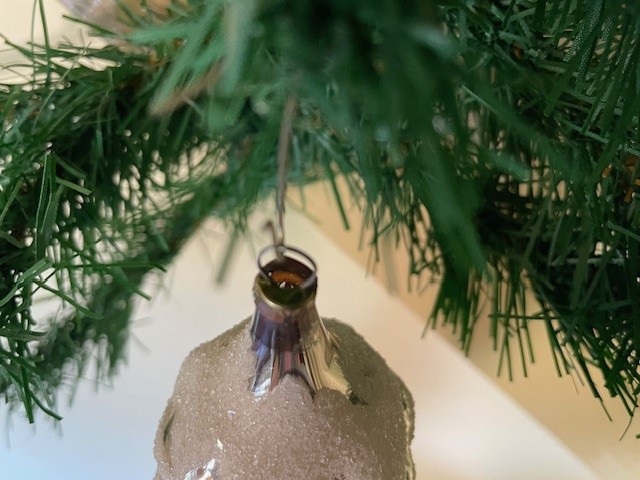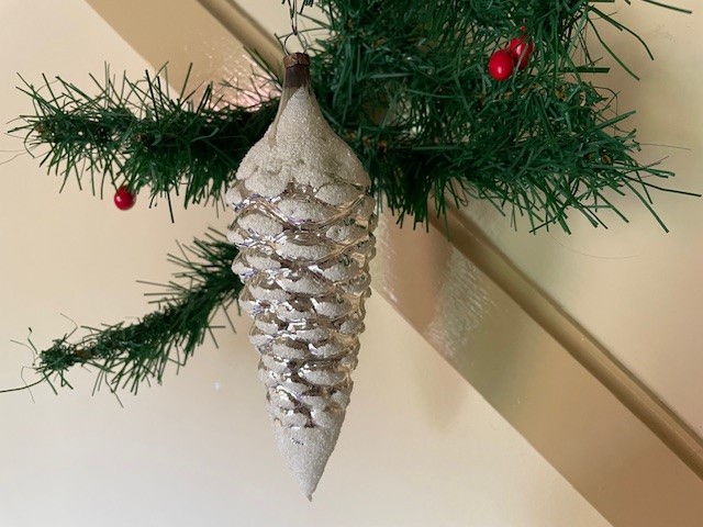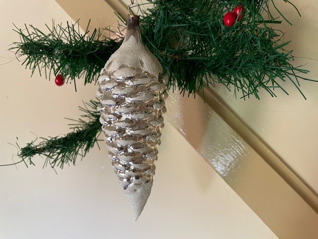 Dit was een van de grotere antieke oude dennenappels van dun geblazen glas in zilver uit de dennenappel kerstboom. De kerstbal is besneeuwd met glasgruis en witte verf en maar liefst 16 cm. groot.(C)