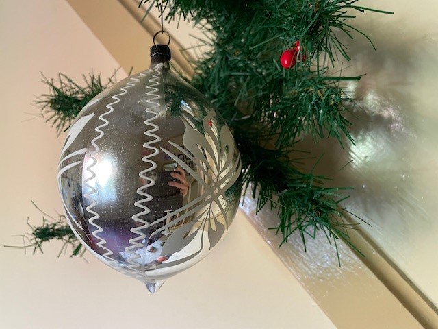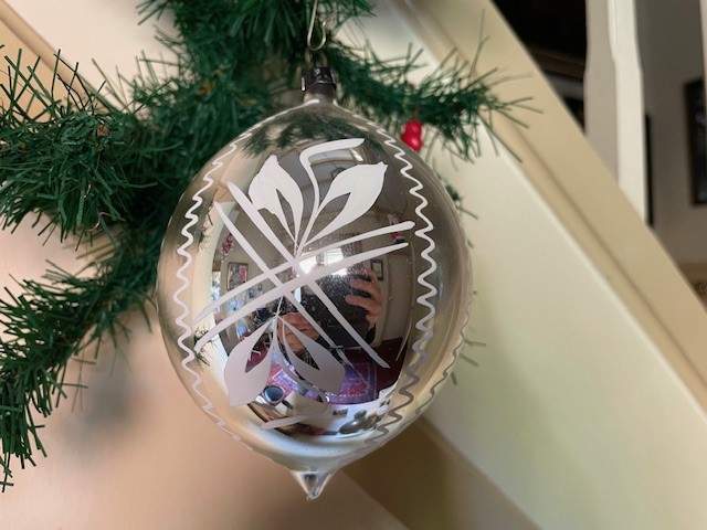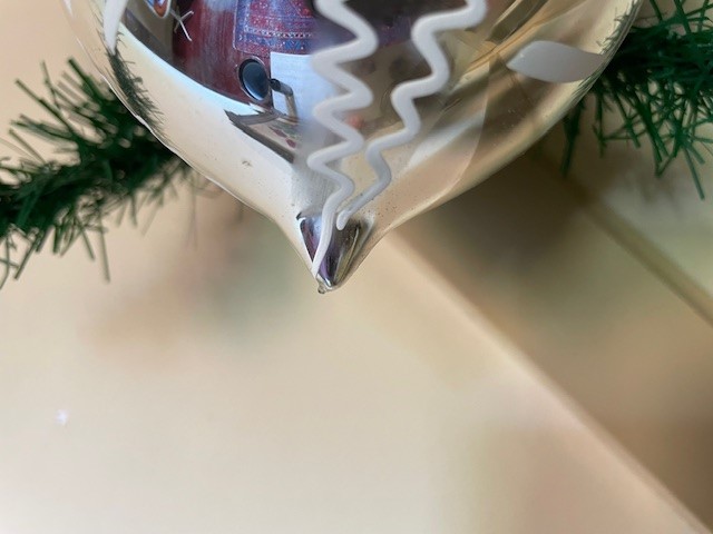 Antieke oude giga grote druppel kerstbal van dun geblazen glas in zilver en aan 3 zijden eenĀ florale versiering van witte verf. De kerstbal is maar liefst 13 cm. hoog en dateert van de 1e helft van de vorige eeuw. Blikvanger in een grote statement boom.
