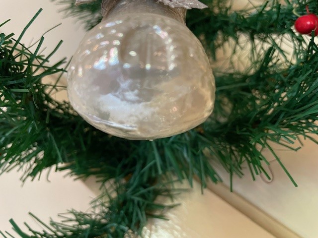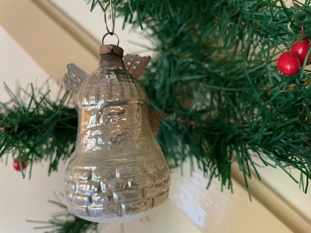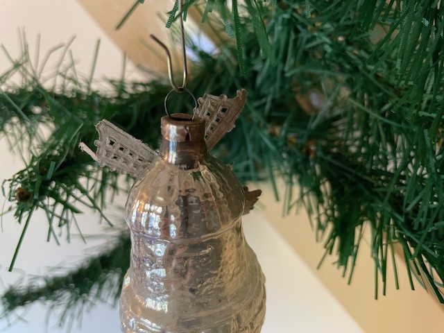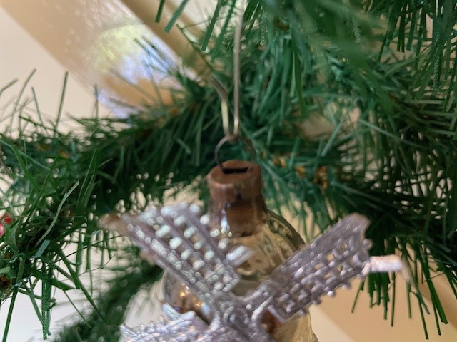 Antieke, oude kerstbal een molen van dun geblazen glas in zilver en zilveren wieken van opengewerkt Dresdner papier in zilver. De molen is tot aan het hangoog 6,5 cm. groot en dateert van het 1e kwart van de vorige eeuw.