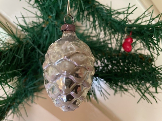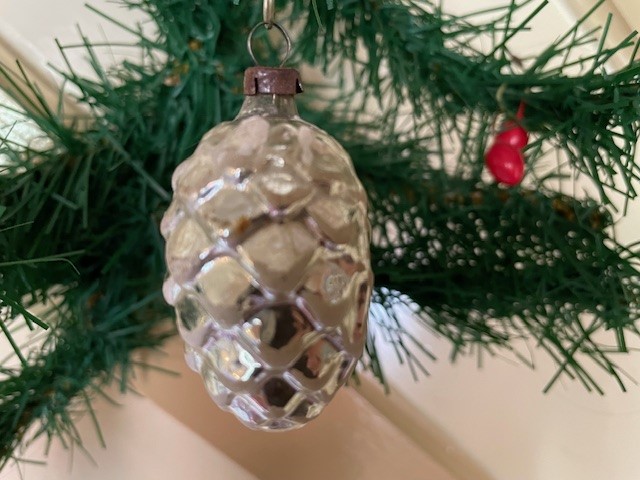Antieke oude kleine dennenappel van dun geblazen glas in zilver met heellicht besneeuwde schubben van witte verf. Het dennenappeltje is tot aan het hangoog slechts 5 cm. groot en dateert van het 1e kwart van de vorige eeuw. Mooi voor de kleine kerstboom.