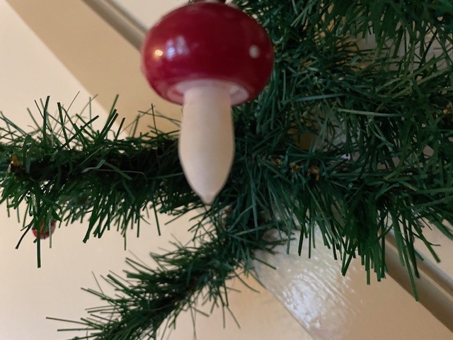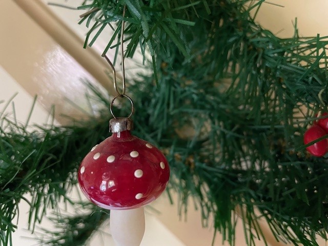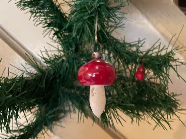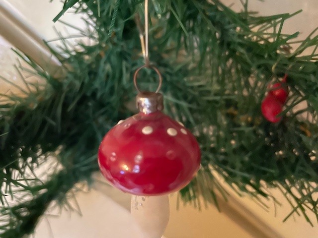 Allerliefst antiek klein paddenstoeltje van dun geblazen helder glas en beschilderd met een rode hoed met witte stippen en een matte witte stam. Dit kleintje is tot aan hethangoog slecht 4,5 cm. groot dus prachtig in tinselboom, feathertree of ieder ander klein boompje.