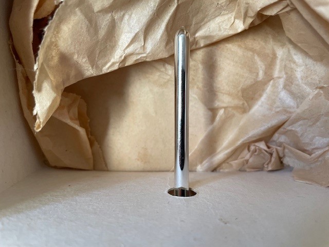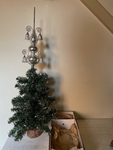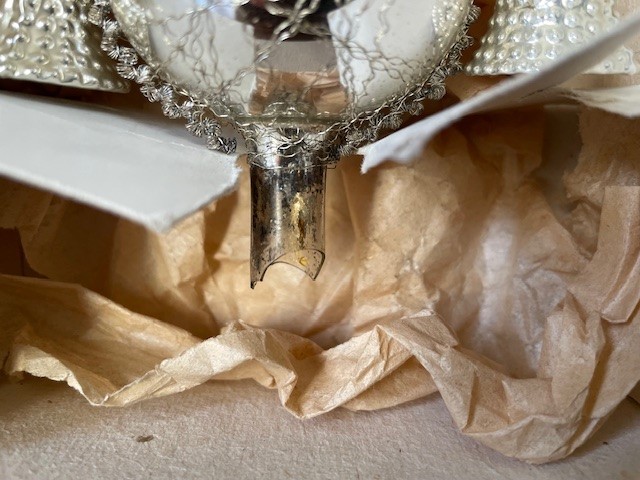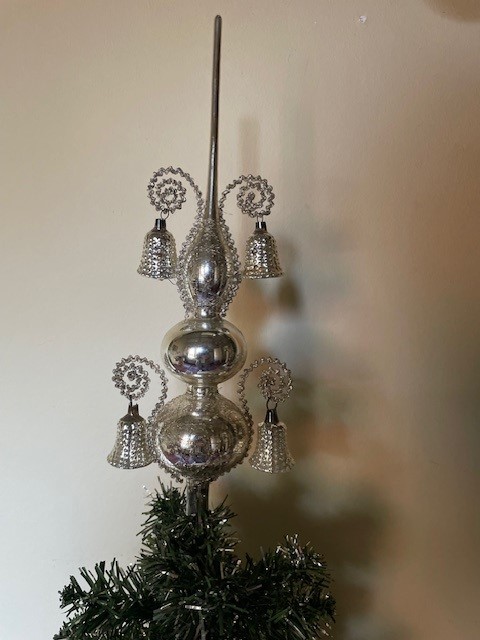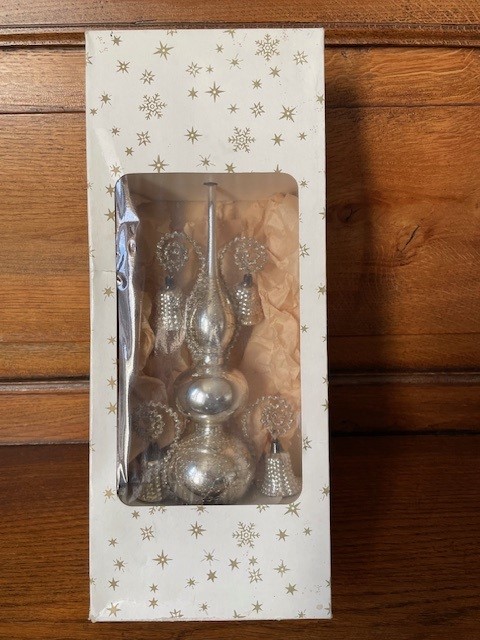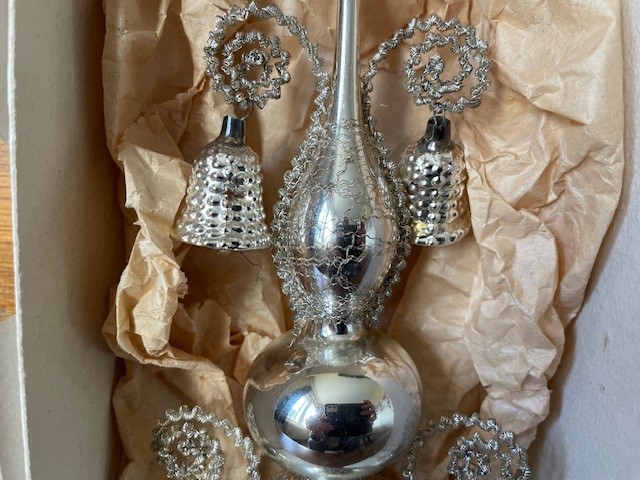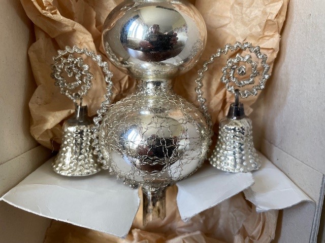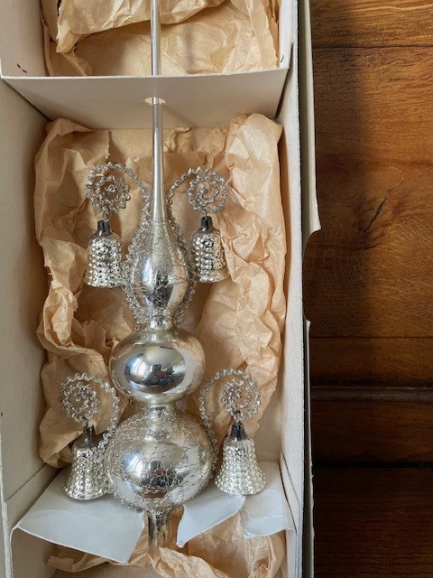 Antieke oude Kerst piek van dun geblazen glas in zilver waaraan 4 klokjes of bellen van eveneens dun geblazen glas. De piek is met draad omwonden en de 4 relief belletjes hangen op 2 hoogten aan gekruld leonisch draad. De onderkant van de piek is rondom gechipt. De piek is 29 cm. hoog en komt in de originele doos. Datering 1e helft 1900.