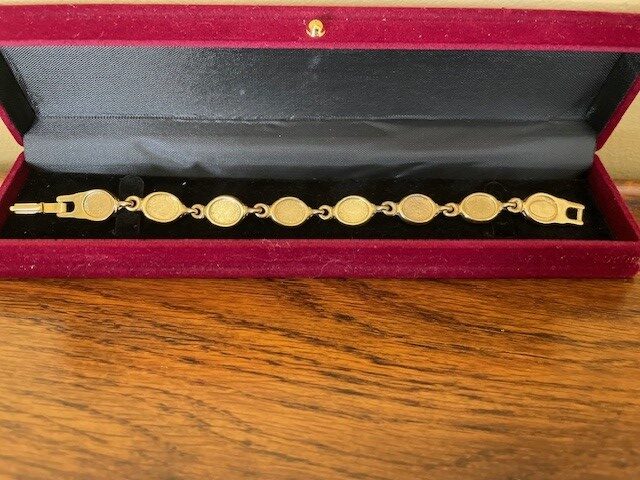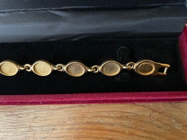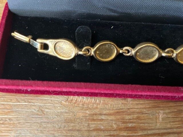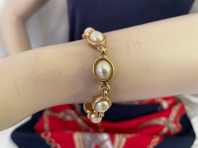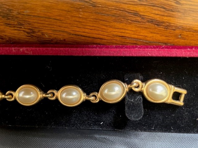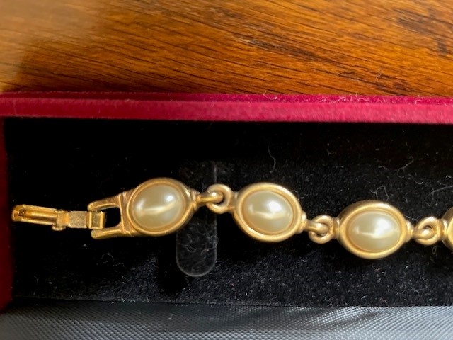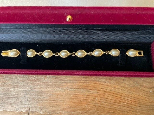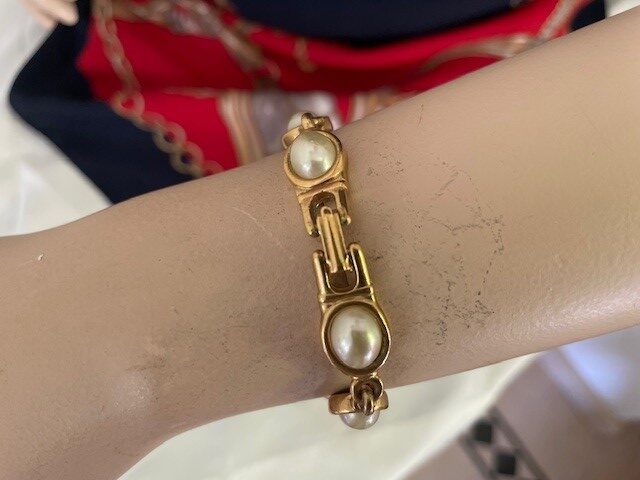 Moie goudkleurige schakel armband met 8 ovale schakels waarin een bouton faux parel.De schakels zijn 2,5 cm. x 1,1 cm. de armband is 18,5 cm. lang, het brutogewicht is 21 gr., ze sluit met een klepsluiting. Datering 1980.