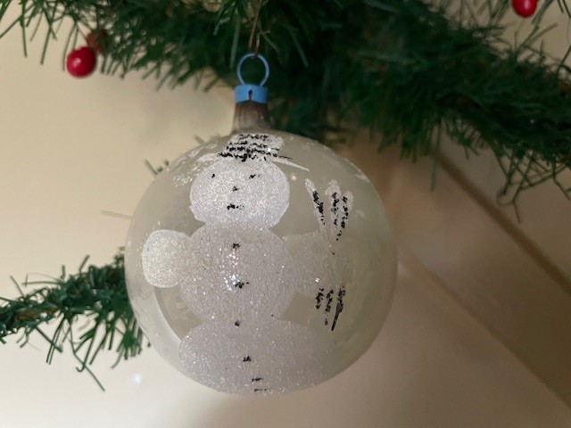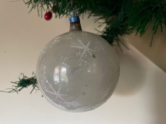Beeldschone antieke kerstbal van mooi gepatineerd glas bedekt met kleine sneeuwvlokken of sneeuwsterren. Op de voorzijde een sneeuwpop met bezem van witte verf en zwart en wit glasgruis. De kerstbal is tot aan het hangoog 8 cm. en dateert van de 1e helft van de vorige eeuw.