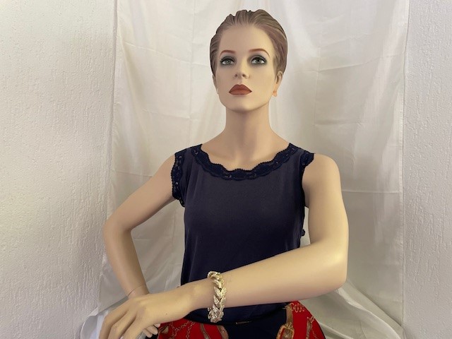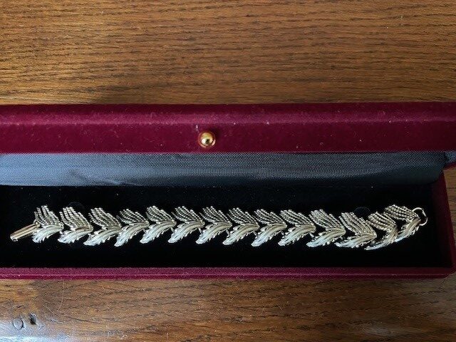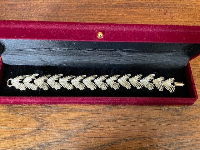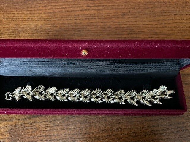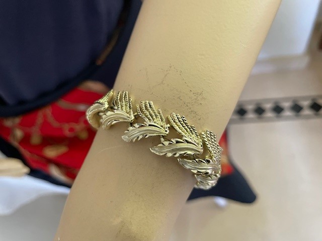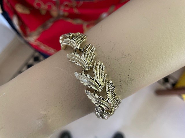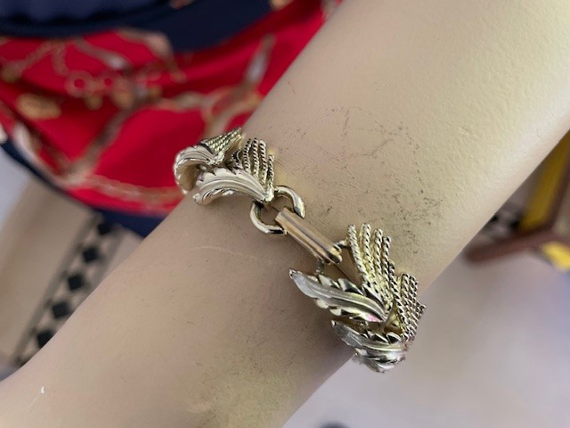 Vintage zilverkleurige Judy Lee-armband, opgebouwd uit 14 schakels met aan 1 kant een blad en aan de andere kant 5 koorden. De armband is 19 cm. lang en 1,8 cm. breed, ze sluit met een klepsluiting in een groot oog en dateert van de jaren 1960. Gemerkt in de sluiting “JUDY LEE”.