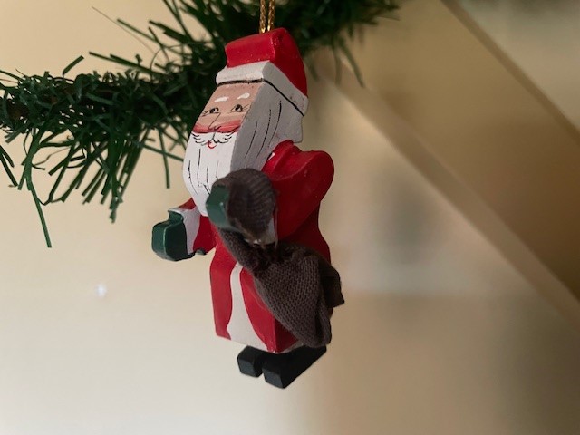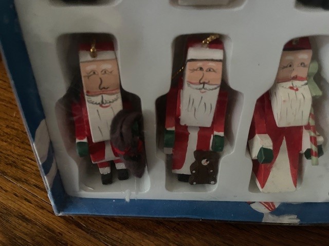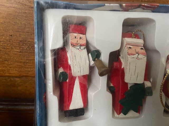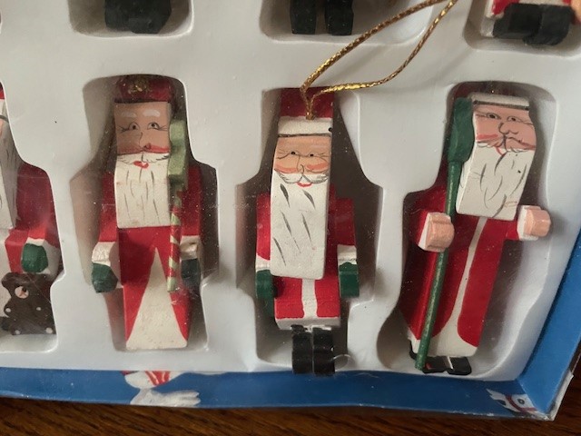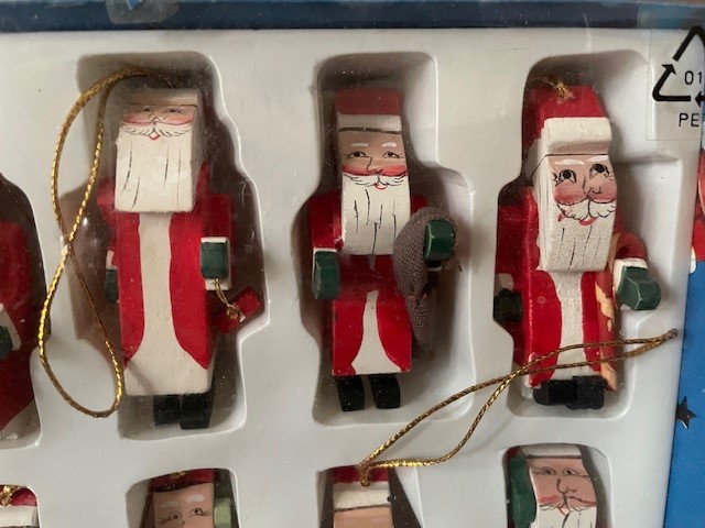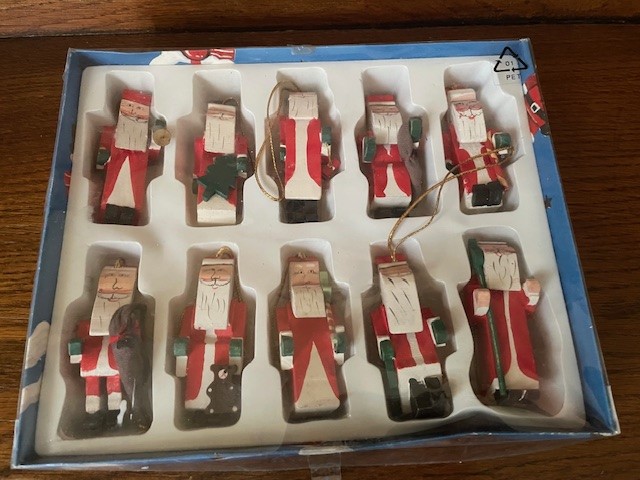 Doos met 10 handgemaakte houten kerstmannen, hand beschilderd in rood, wit en bruin of groen en ongebruikt. Iedere kerstman heeft een eigen, met de hand geschilderd gezicht en kostuum en ze dragen een kerstboom, klok, staf, snoepgoed, stoffen zak, beer of gewoon een nog ingepakt cadeau. De kerstheren zijn van bijna 7 tot ruim 7 cm. groot en dateren van 1970-1980.