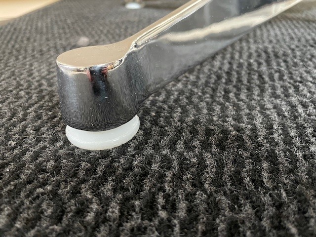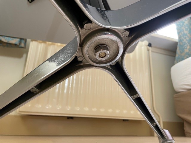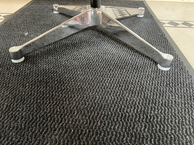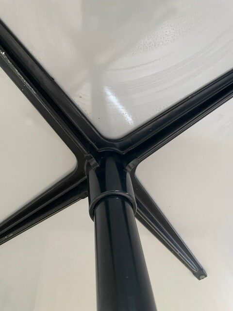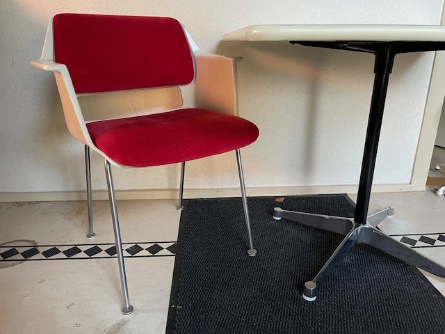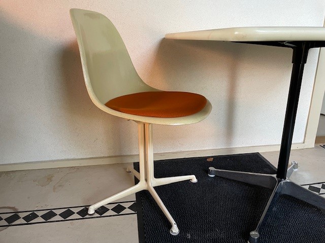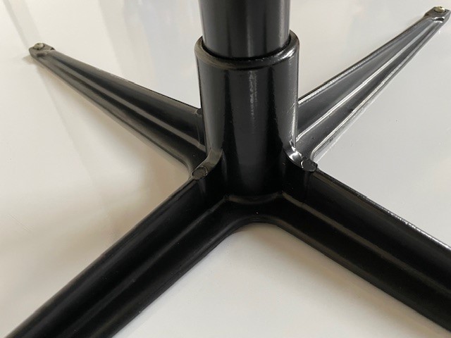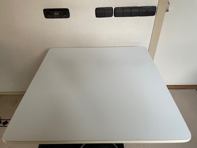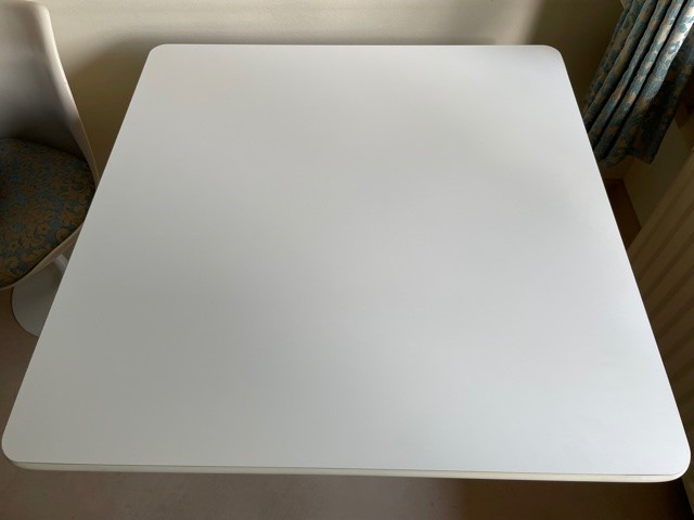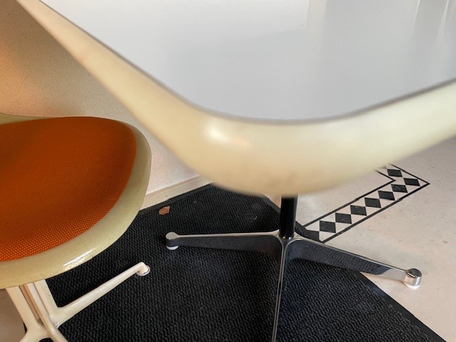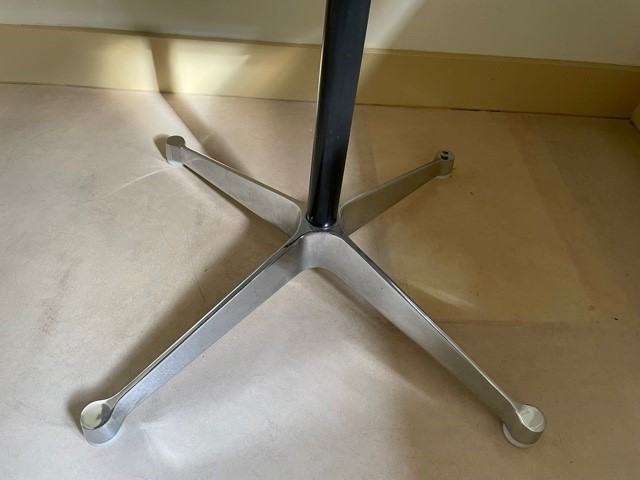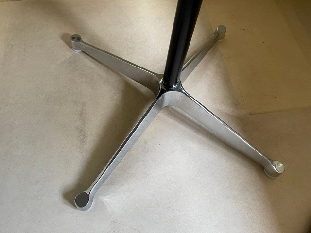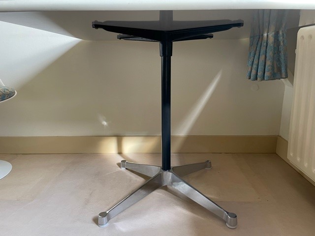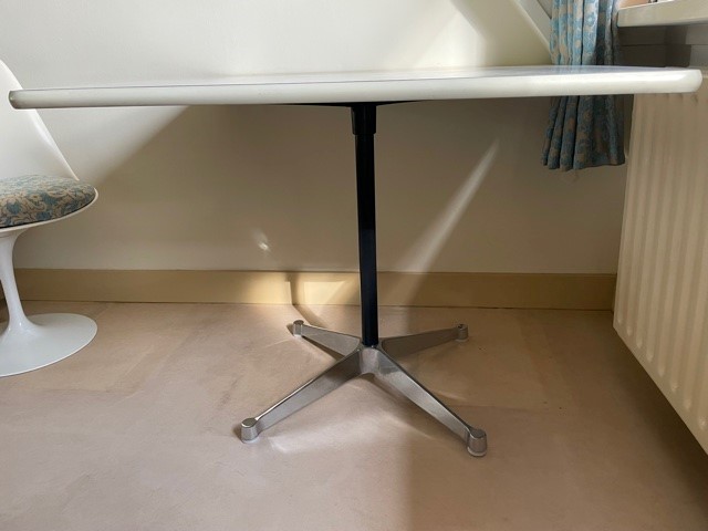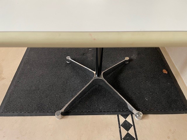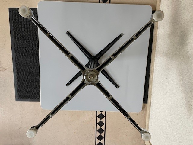 Mid-century segmented square tafel met chromen poot op zwarte stam en wit formica tafelblad omrand met een kunststof band van Charles en Ray Eames voor Herman Miller. De eettafel, perfect voor 2 of 4 personen, is 90 cm. x 90 cm. groot, de hoogte is 72 cm., de lengte van het kruis van de poot is 70 cm.