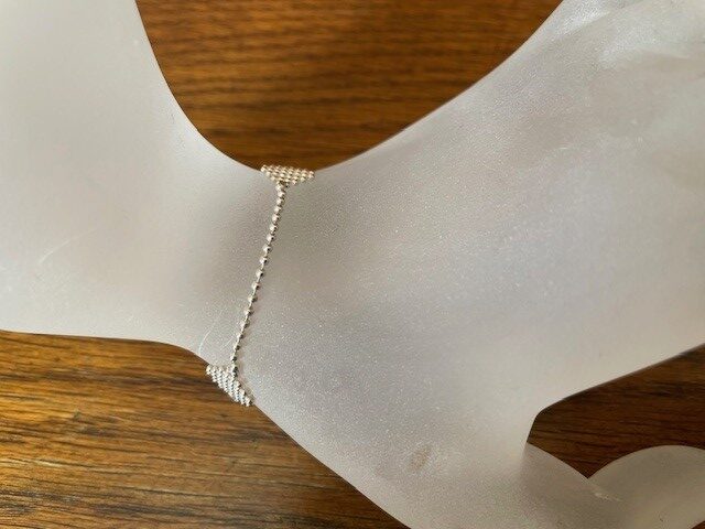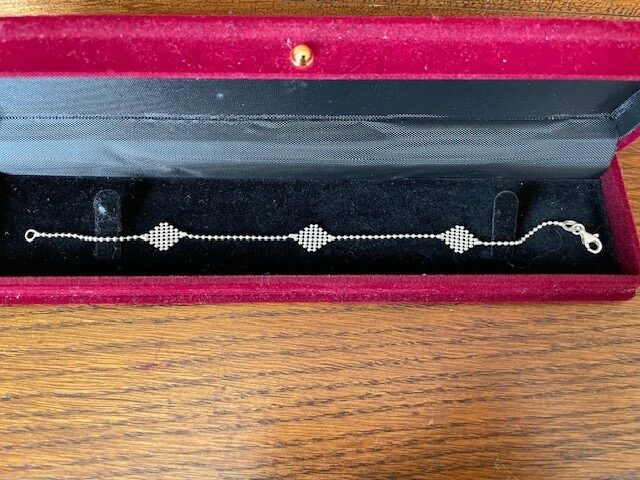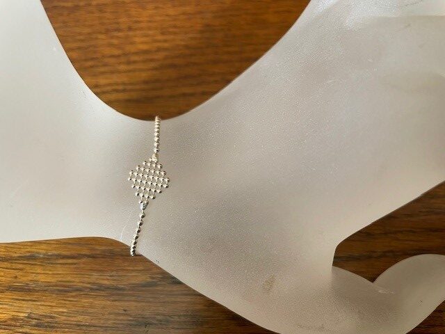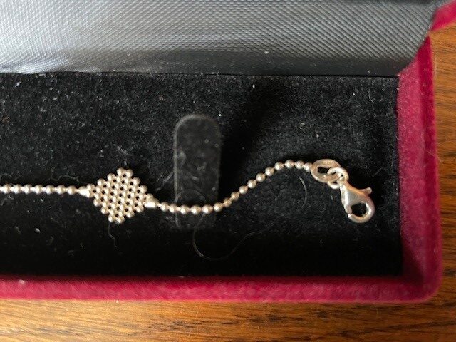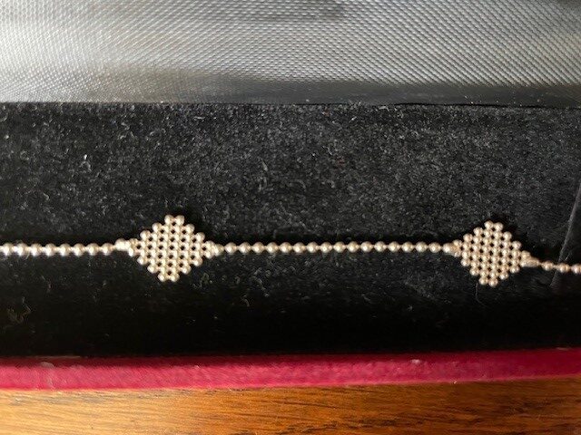 Fijne 1e gehalte zilveren armband van bolletjes en 3 tussenstukjes in de vorm van een ruit met bolletjes. De ruit heeft een breedte van ruim 10 mm., de armband is 19,5 cm. lang en sluit met een karabijnslot, het gewicht is 2,2 gr. Gekeurd met zwaardje 925 en verantw.teken.