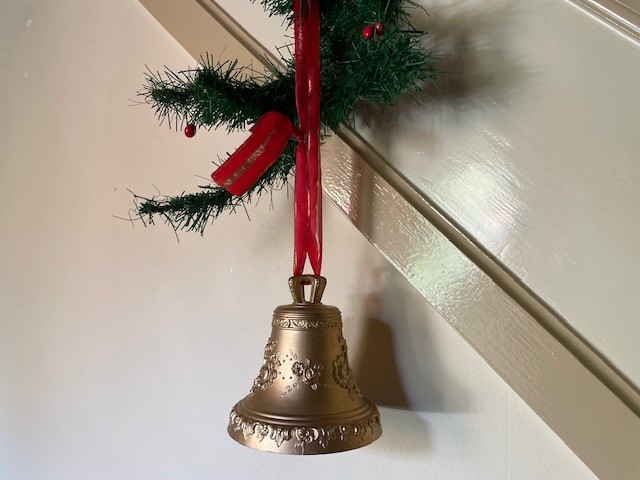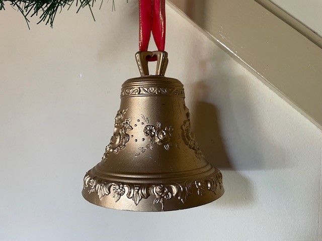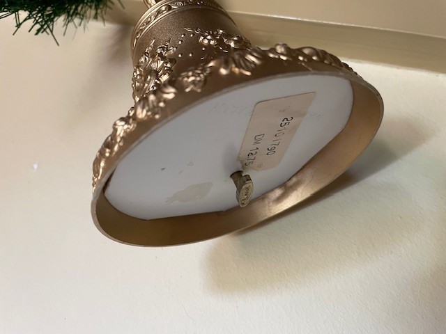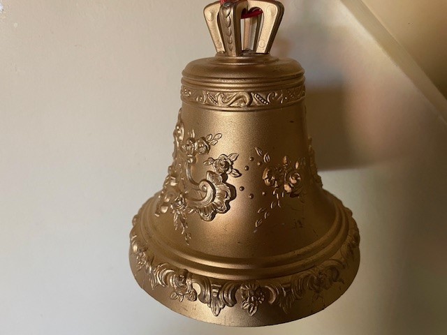 Opwind Kerstklok een mechanische muziekdoos van kunststof in gouden kleur met relief in rococo stijl met rozen. Ze is tot en met het meegegoten dubbele oog bijna 12 cm. hoog, de diameter van de onderzijde is ruim 11 cm. De klok of speeldoos speelt “Stille Nacht” en is in blindmerk op de onderzijde getekend “made in Germany”. Ze dateert van de jaren ’70 van de vorige eeuw.