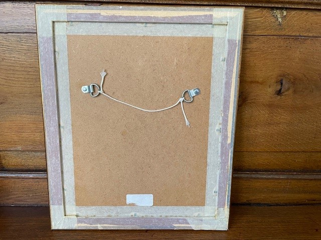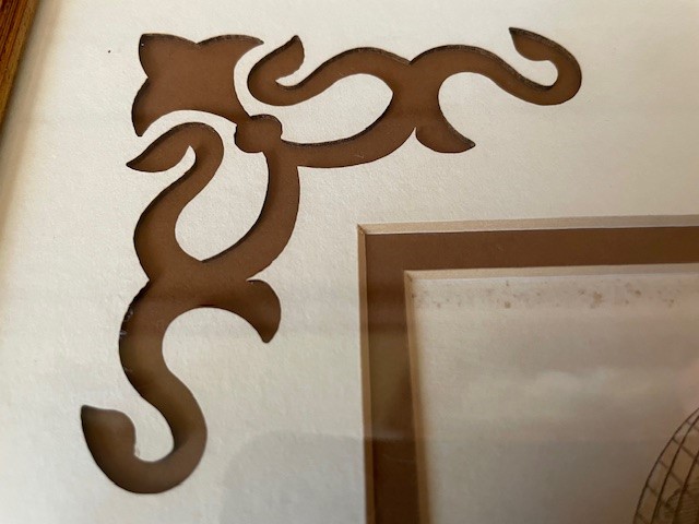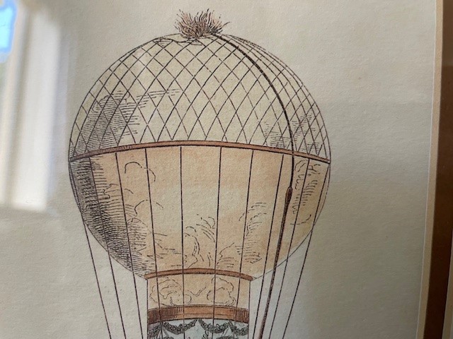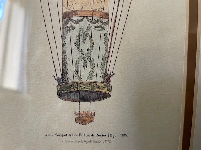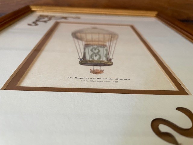 Prent van een antieke luchtballon, “Aero-Mongolfiere de Pilatre de Rozier (16 juin 1785)” zeer vakkundig ingelijst met 2 hoge passe-partouts, de onderste in bruin en de bovenste in cremekleur en in 2 diagonale hoeken uitgesneden. Gedrukt bij “graffliche Tassotti n.795”. De goudkleurige lijst is ruim 32 cm. x 27 cm., de prent is ruim 15 cm. x 10,5 cm.