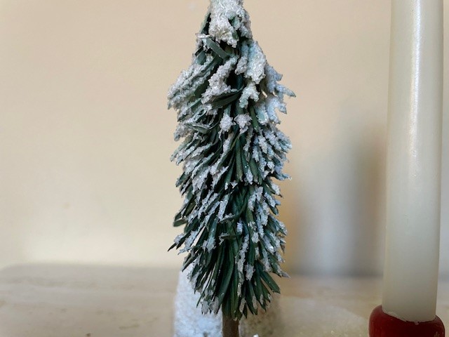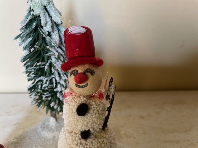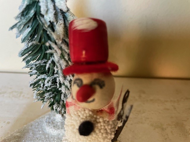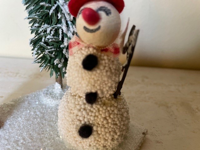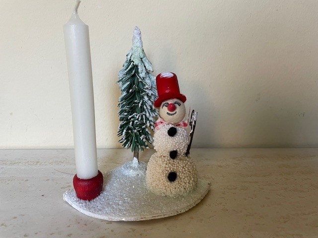 Antieke oude kaarsenstandaard op een driehoekig plateau van dik karton van 7,5 cm. x 7,5 cm. x 10,5 cm. breed en bedekt met glasgruis en witte verf. Op het plateau een rode kaarsenstandaard met een kleine kaars, een kerstboom van groen papier en een sneeuwpop met stoffen geruit sjaaltje, een paper mache kop en een rode plastic en vilten hoed en neus. Datering 1960.