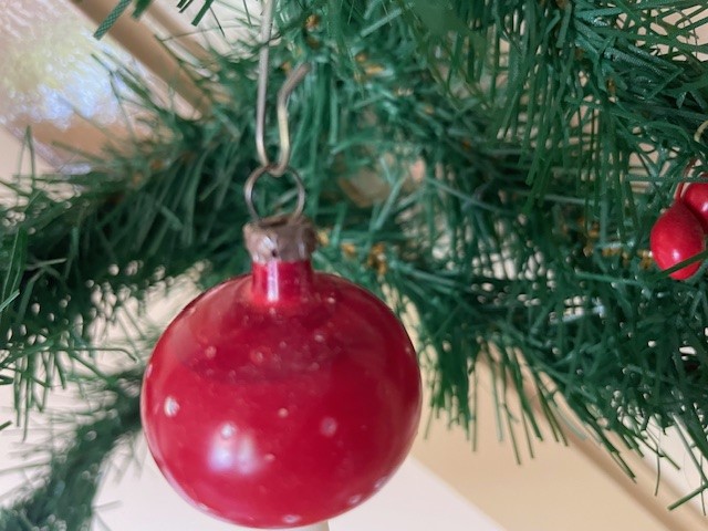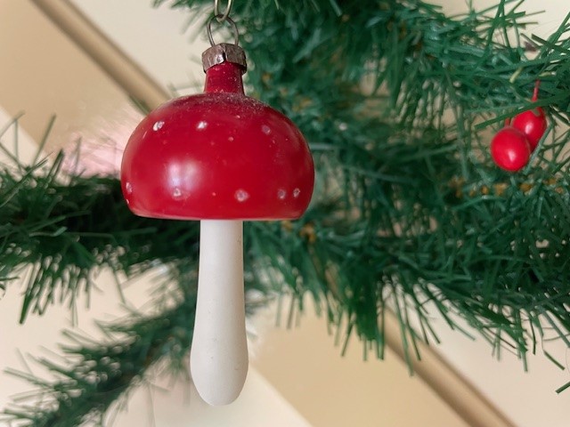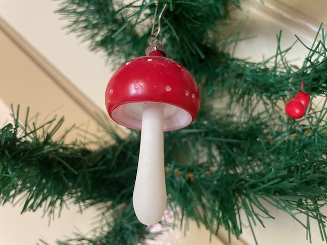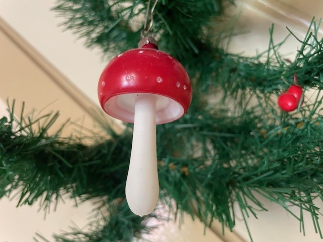 Antieke oude kerstbal een paddenstoel van dun geblazen glas met rode hoed. De stam van de paddenstoel is met witte gelatineverf beschilderd en dateert van het 1e kwart 1900. Tot aan het hangoog is ze ruim 6,5 cm. groot.