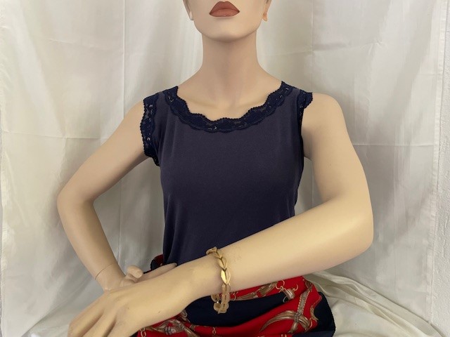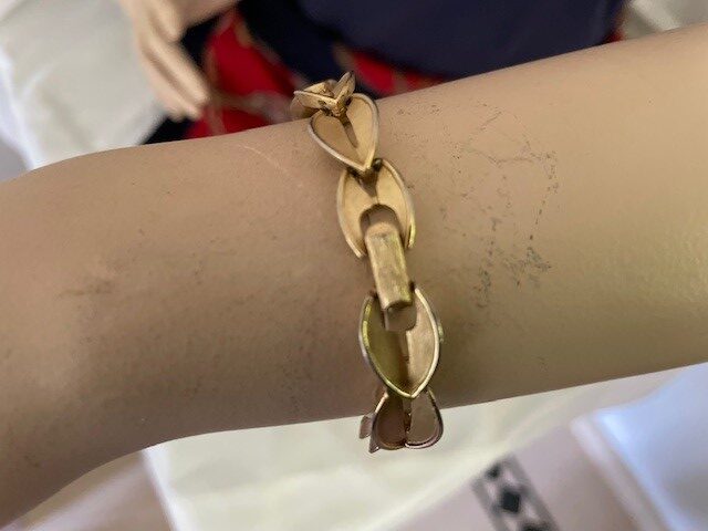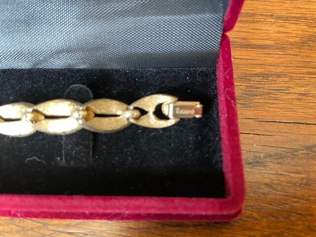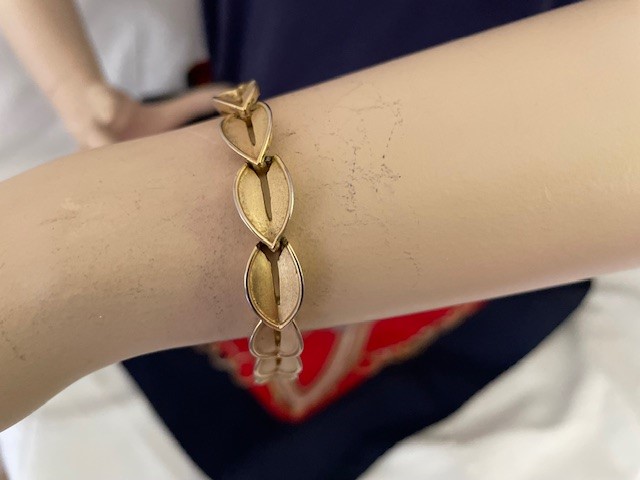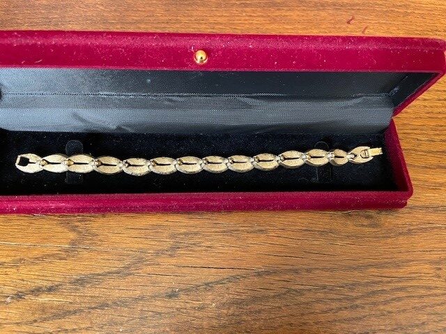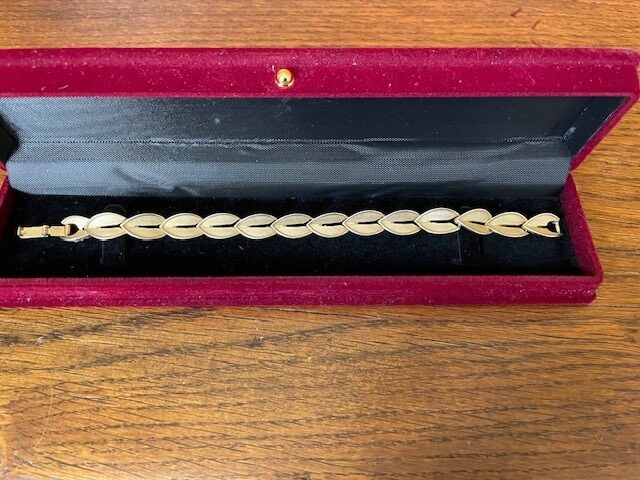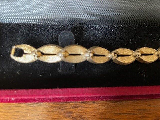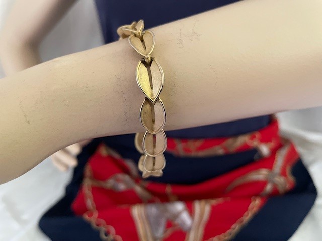 Elegante goud kleurige schakel armband van Trifari met een reeks van 14 geschakelde blaadjes . De blaadjes zijn op de voor en achterzijde gearceerd en op de voorzijde zijn de blaadjes afgezet met een gladde rand. De armband is 19 cm. lang en sluit met een klepje. Op de klepsluiting gemerkt TRIFARI c, datering 1950-1960.