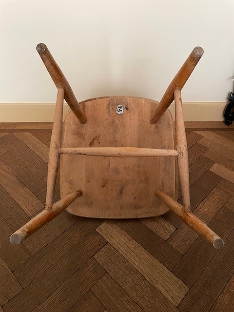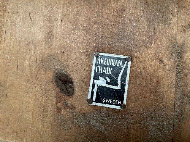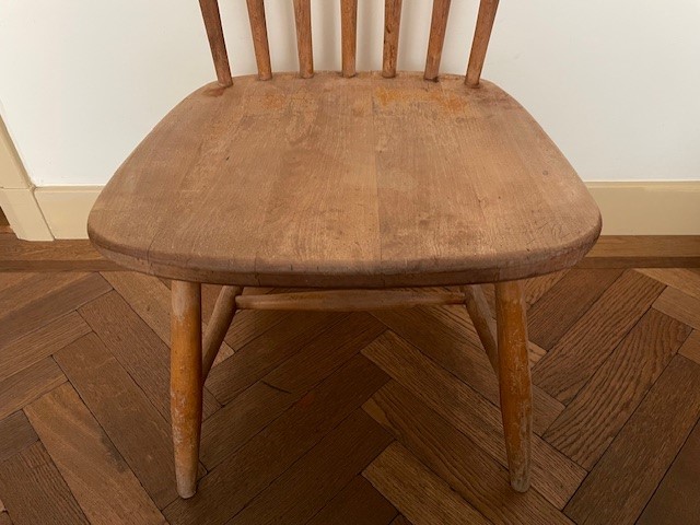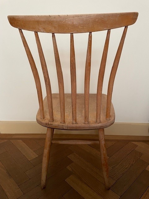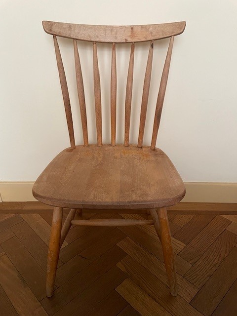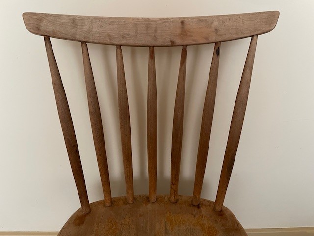 Zweeds design massief berken spijlenstoel van Bengt Åkerblom & Gunnar Eklöf voor Åkerblom. De stoel is gemerkt met het originele etiket van de fabrikant.  De hoogte is 84 cm., de zithoogte is 41 cm., de breedte 44 cm., de diepte 46 cm. Op de onderzijde het zwart wit metalen Äkerblom label uit de jaren 1950. Ophalen.