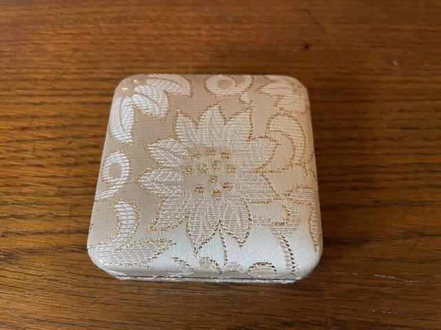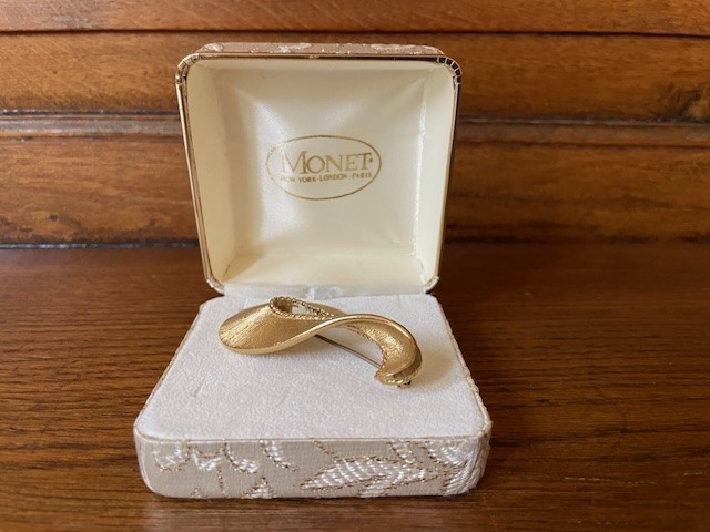 Prachtige vintage lintvormige broche met bolsluiting van Monet in origineel Monet etui. De broche heeft een warme gouden kleur, is aan een zijde langs het gearceerde lint met een koordrand afgewerkt, aan de andere zijde met een gladde rand. De broche is 6,5 cm. lang en 2,8 cm. breed, het etui is van stof, met wit en gouddraad geborduurde bloemen en ruim 7,5 cm. x 7,5 cm. groot. Gemerkt “Monet”. D