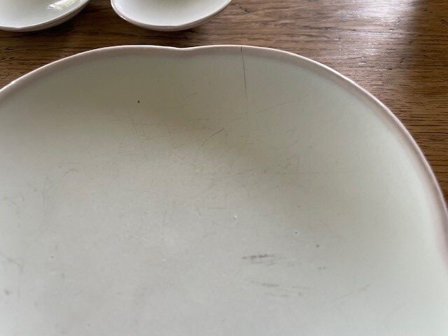 Het bestaat uit een taartschaal met 6 bordjes, 1 van de bordjes heeft een barstje, zie laatste foto