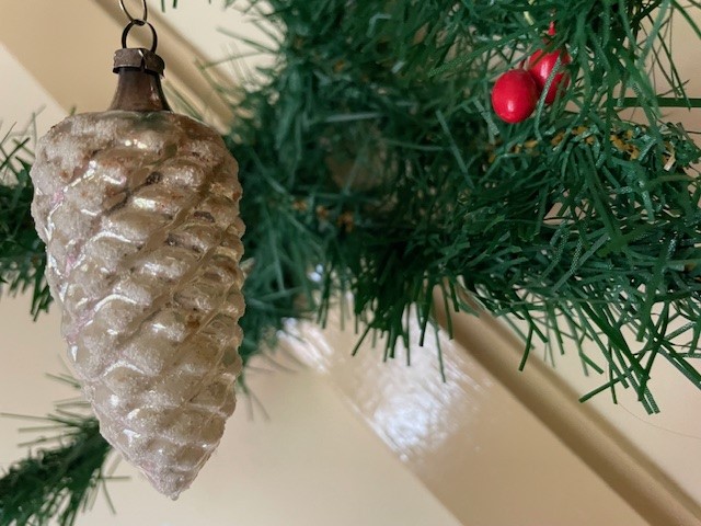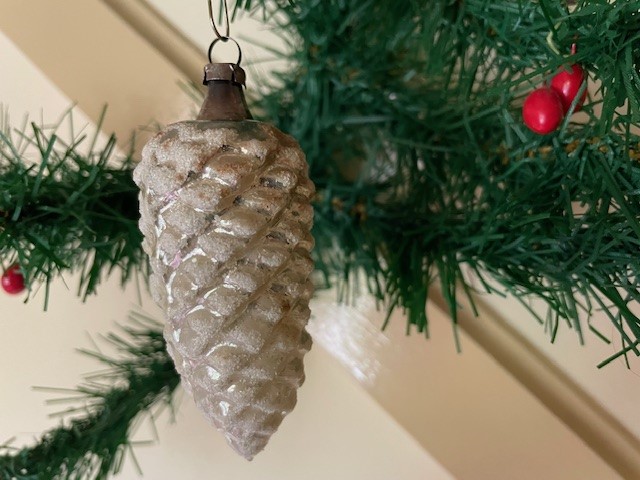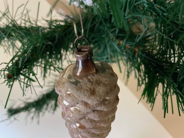 Antieke oude kerstbal uit de 1e helft van de vorige eeuw. De dennenappel, relief geblazen van dun glas in zilver en besneeuwd met glasgruis en witte verf op de schubben is tot aan het hangoog 8 cm. groot. (ro).