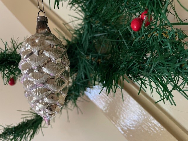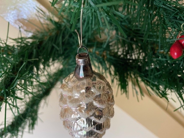 Antieke oude kerstbal uit het midden van de vorige eeuw, een dennenappel van dun geblazen glas in zilver en besneeuwd met glasgruis en witte verf. De dennenappel is tot aan het hangoog 8,5 cm. groot.(A)