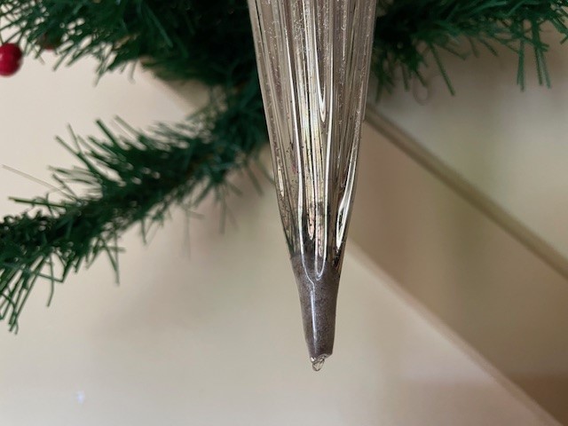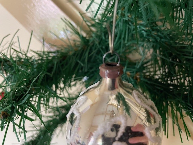 Oude retro kerstbal een ijsco of tol van dun geblazen glas in zilver, op de bovenzijde van de tol beschilderd met een decoratie van witte verf. De kerstbal dateert van het midden van de vorige eeuw en is tot aan het hangoog maar liefst 15 cm. groot.
