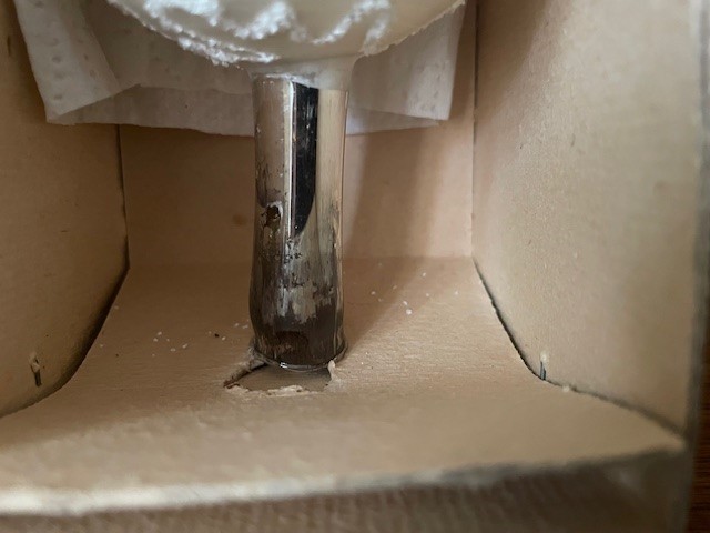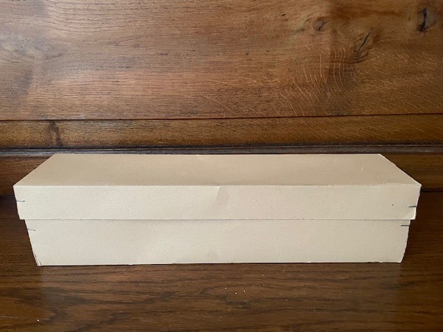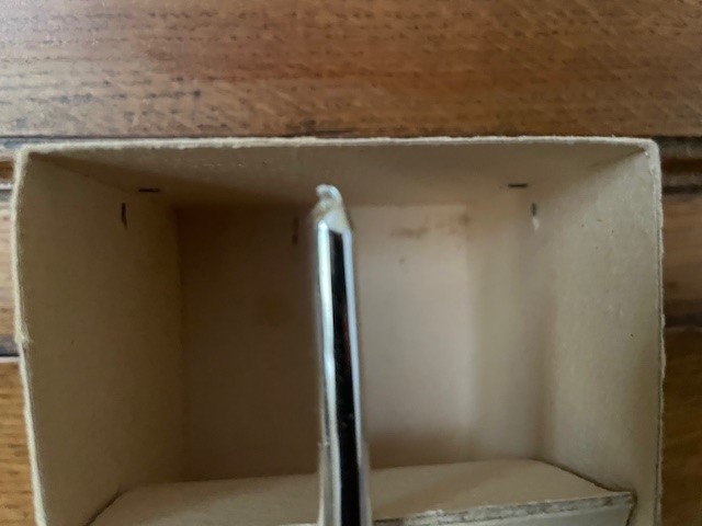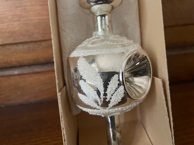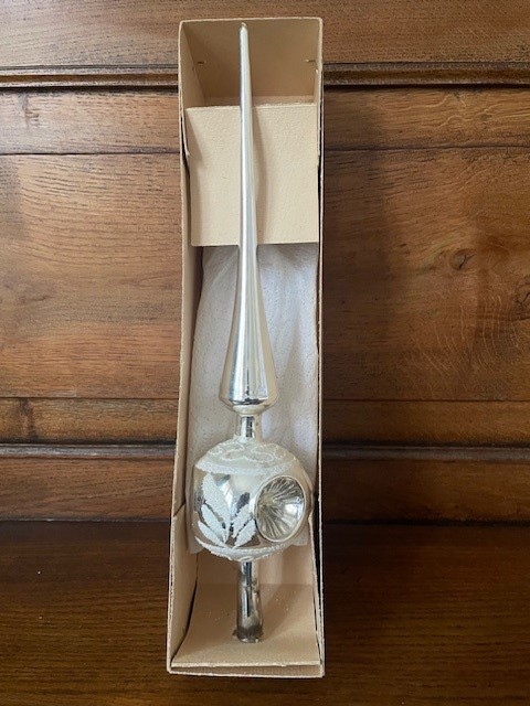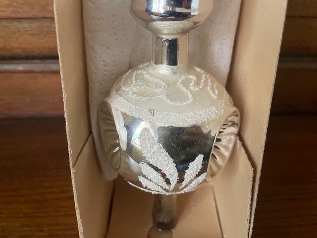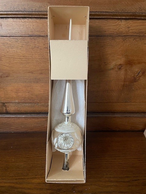 Oude antieke piek in de originele doos met 1 bol waarin 3 reflexen, kraters of deuken van dun geblazen glas in zilver. Tussen de reflexen of deuken is de bol floraal gedecoreerd met glasgruis en witte verf. De lengte van de piek is 33 cm., datering midden vorige eeuw.