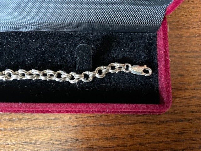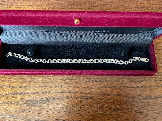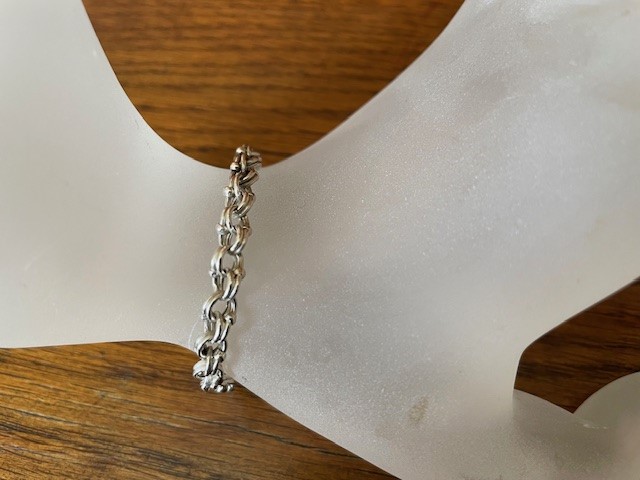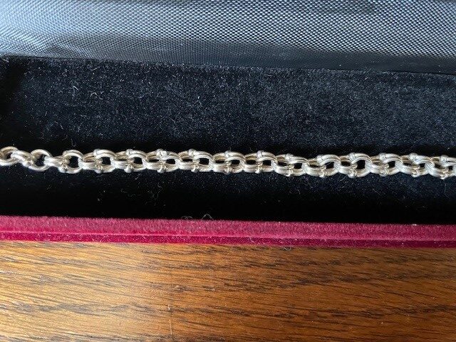 Antieke, oude 1e gehalte zilveren schakelarmband met twee maal een dubbel oog aan een schakel. De verbinding tussen de 2 dubbele ogen heeft een zilver bolletje. De armband is bijna 20 cm. lang en sluit met een lobster of karabijn sluiting. Het gewicht is 5,6 gr. Getekend 925.