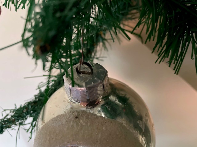 Oude heel grote deuk, reflex of krater kerstbal van geblazen glas in zilver. De bloemvormige krater is omrand met een band van 2 cm. glasgruis en witte verf. Tot aan het hangoog is de kerstbal 9 cm. groot en ze dateert van de 2e helft van de vorige eeuw. Op de dop “made GDR”.