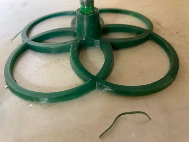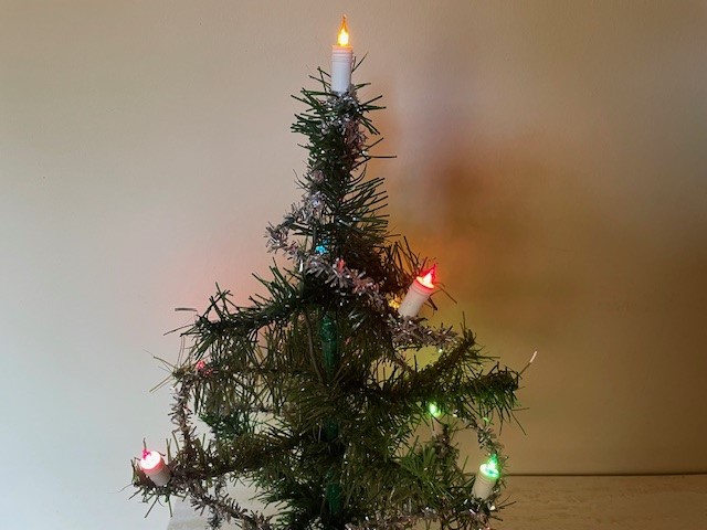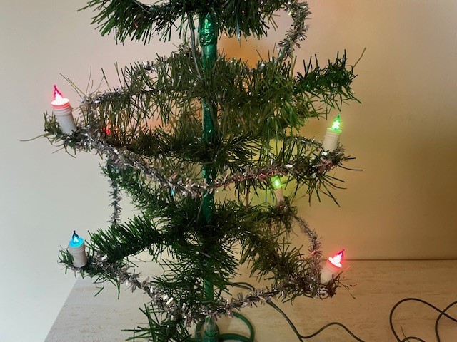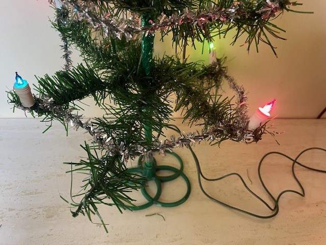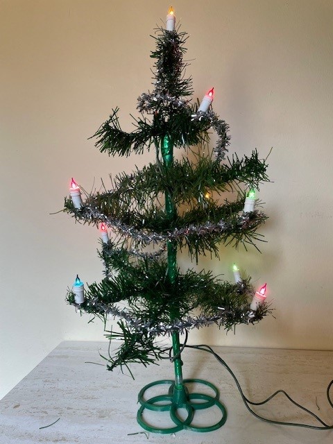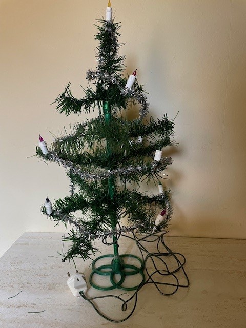 Oude retro kerstboom van plastic op groene ronde cirkelvormige voet. Het boompje is versierd met een tinsel slinger en rood, blauw, groen en gele lampjes aan een 220 V. stekker. Ze is 54 cm. hoog en dateert van de jaren 1950-1960.