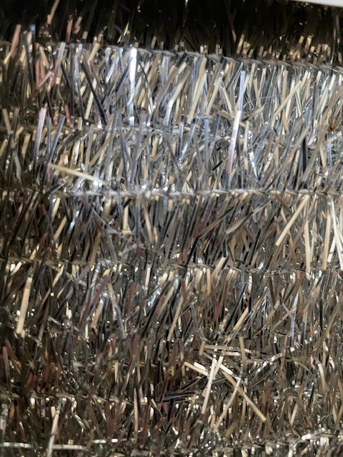 Retro wit met gouden doos met grof zilveren Christmas garland of slingers op dikke katoenen draad gezet voor in de kerstboom. De doos met slingers is 23 cm. x 14 cm. x 3 cm. groot en dateert van het midden van de vorige eeuw.