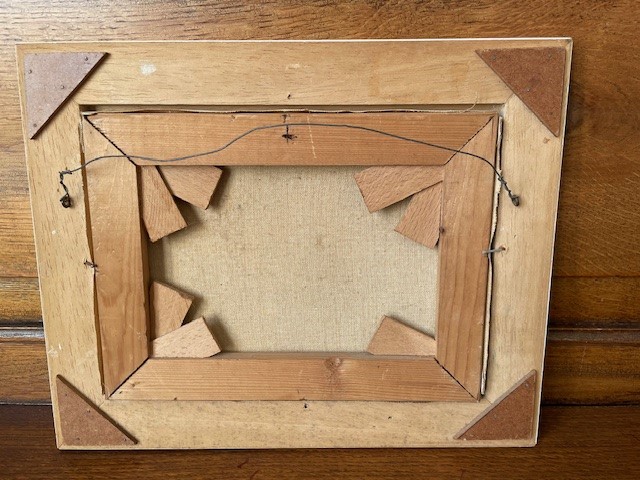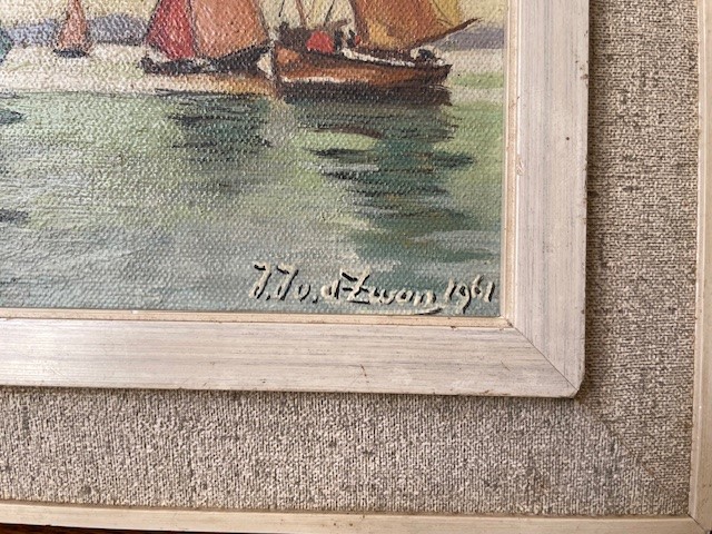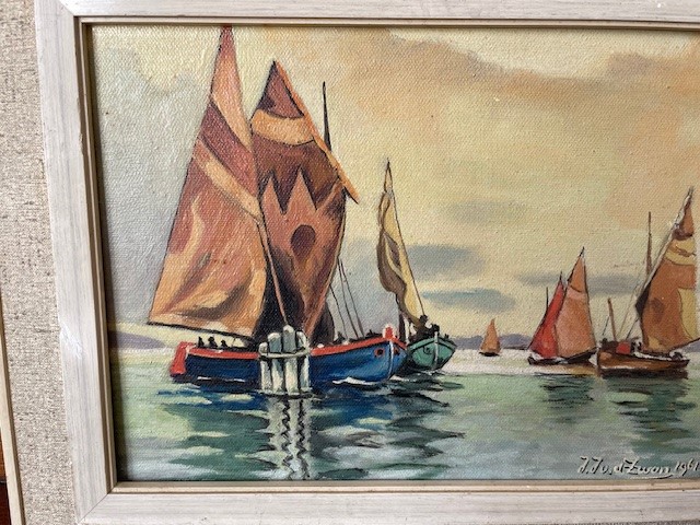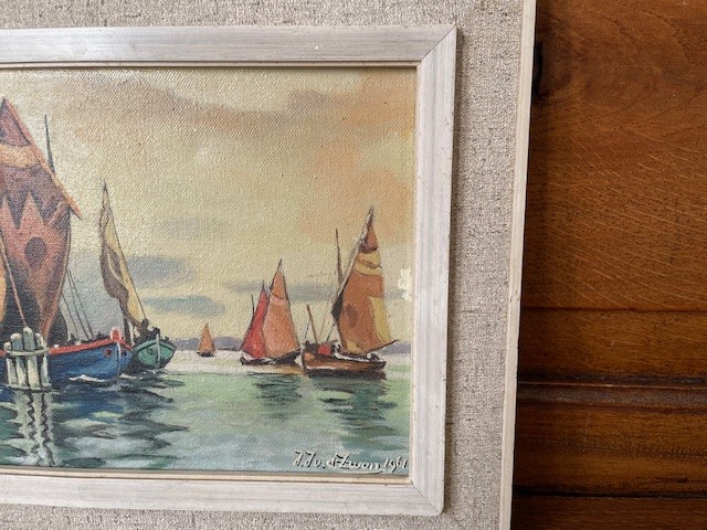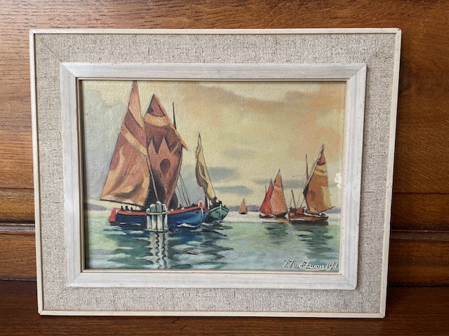 Schilderijtje met zeilschepen uit de beginjaren 1960 in origineel sixty’s lijstje met gemeleerd vistram tussen het hout. Het schilderijtje met lijst is 32 cm. x 26 cm., het doek is 24 cm. x ruim 18 cm., gesigneerd J.J. van der Zwan 1961.