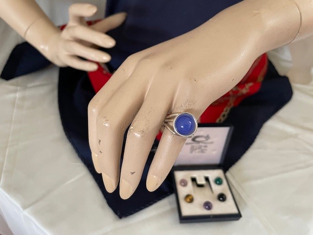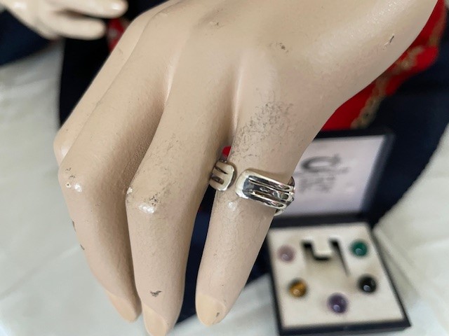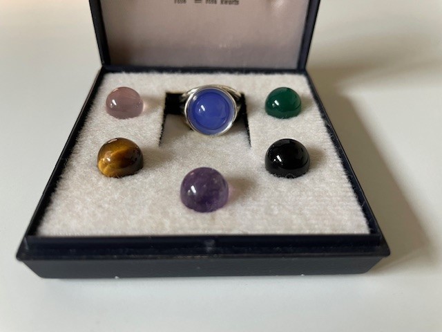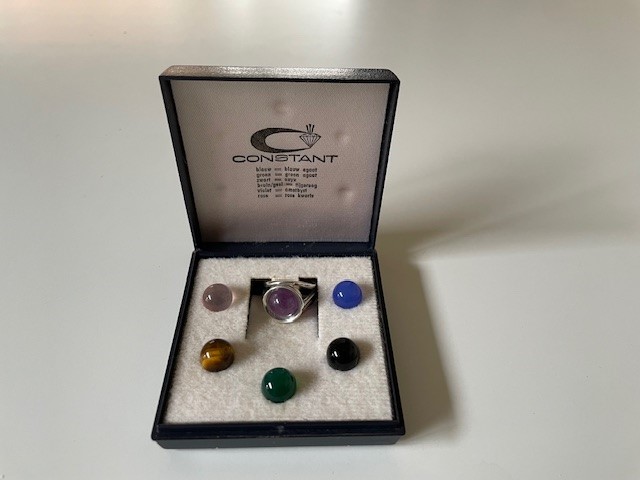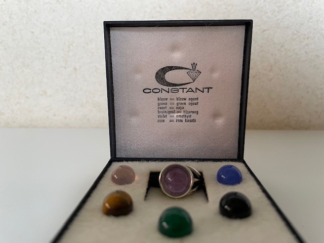 Van Constant uit de jaren 1960 het originele doosje met zilveren ring en 6 verschillend gekleurde edelstenen, rond cabochon geslepen die verwisselbaar zijn. De edelstenen zijn rose kwarts, amethist, tijgerrog, blauw en groen agaat en onyx. De ring is aan een kant open en heeft een minimale maat van 48/15,25. Ze is Ned.gekeurd met het zwaardje 835 voor 2e gehalte zilver.
