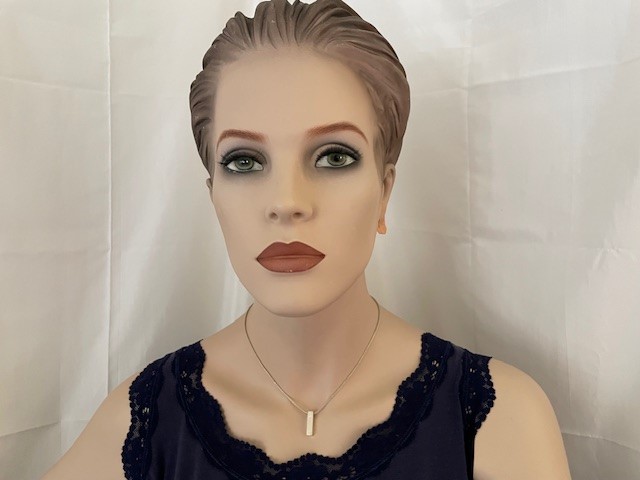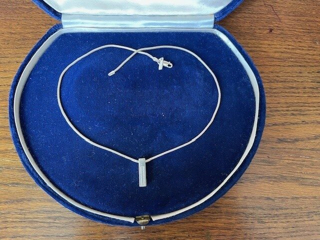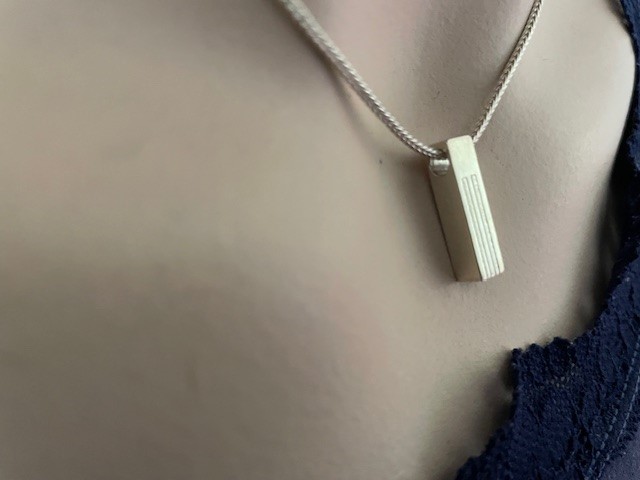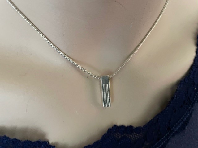 925/1000 zilveren vossenstaart collier waaraan een langwerpig 1e gehalte zilveren blokje van 20 mm. x 5 mm. x 5 mm. groot hangt. Het blokje is aan een zijde langwerpig gearceerd. Het collier is 41,5 cm. lang, heeft een karabijn slot en het brutogewicht is 8,9 gr. Getekend Mexx en 925 voor 1e gehalte.