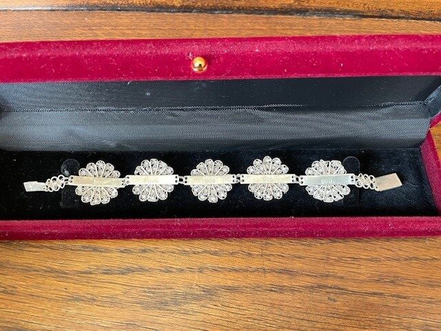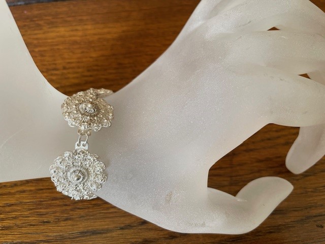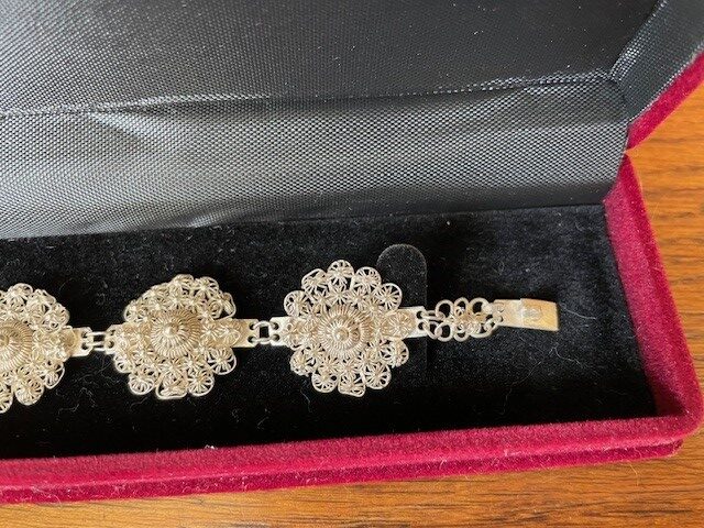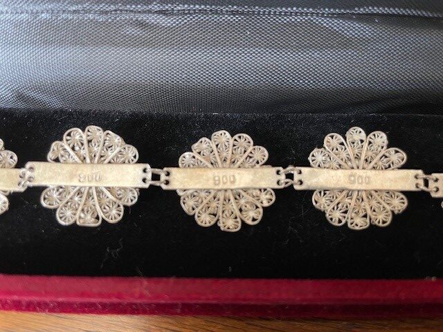 Lieflijke bloemen armband van filigrain zilver 900/1000 uit Indonesie jaren 1960. De armband weegt 12gr., is 16 cm lang en heeft een schuifslot. De 5 bloemen hebben een diameter van 5 cm. Getekend 900 op de achterzijde van elke bloem.